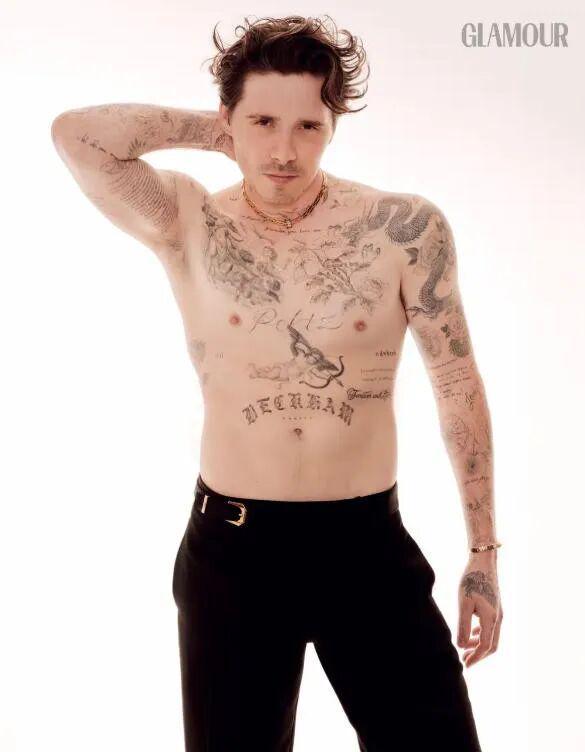 2025年年中,大布给德国版《Glamour》杂志拍过一个封面,那时他肩膀处的“爱心Mum”就已经看不见了,换成了一条龙文身。